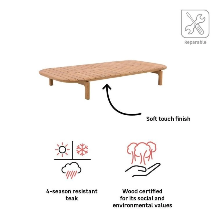 Para garantizar una larga vida útil para tus muebles Aurora, se recomienda aplicar aceite de teca anualmente para alimentar la madera y resguardarlos durante períodos prolongados de uso. También se puede aplicar un barniz para preservar el color original de la mesa. Reparable, hay piezas de repuesto disponibles para prolongar la vida útil de tus muebles.