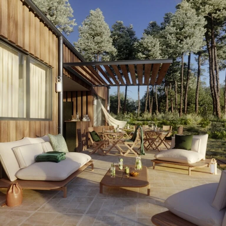 La gama Aurora, con esquinas redondeadas y acabado en miel, proporcionará una atmósfera suave y cálida a tu exterior. Se adapta perfectamente a una terraza verde, resaltando su color dorado. Completa esta mesa de café con el sofá y las sillas de jardín Aurora para un espacio armonioso y acogedor, y la mesa y sillas Aurora para un área de comedor adicional.