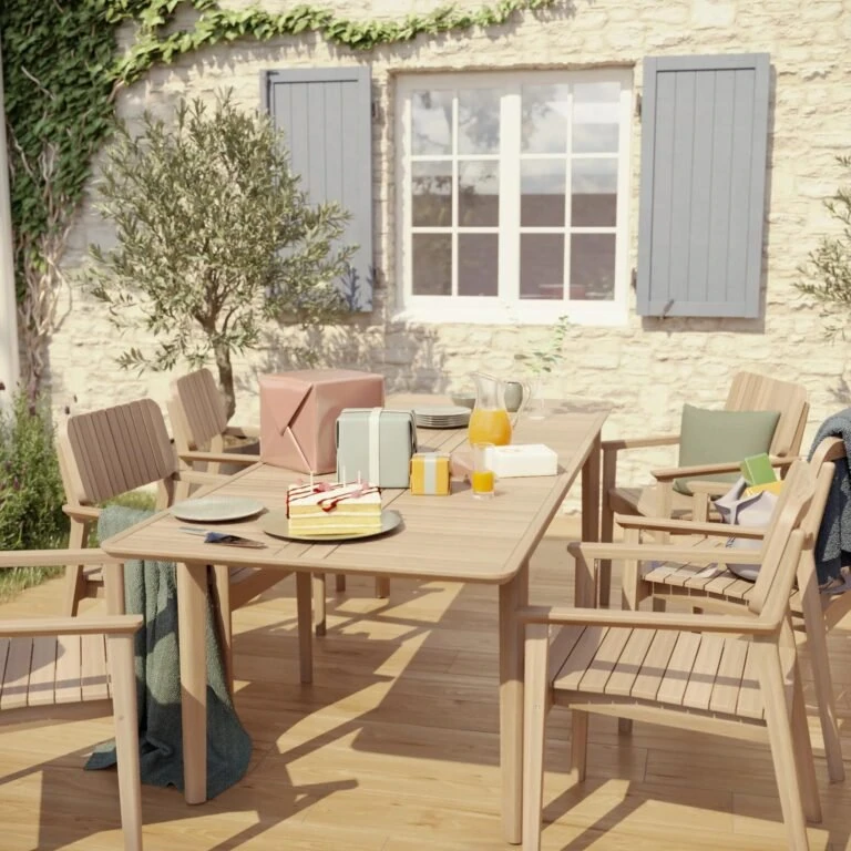 El diseño natural y tradicional de la mesa Atlas te permite encontrar fácilmente su lugar en tu jardín o terraza. Acompañá a tu mesa con sillas de la misma gama para obtener un comedor completo, armonioso y cálido. Para disfrutar de un café al final de la comida cómodamente instalado en tu terraza, te recomendamos el mobiliario de jardín Atlas, que retoma los códigos de diseño de la mesa para una perfecta armonía de tu exterior.