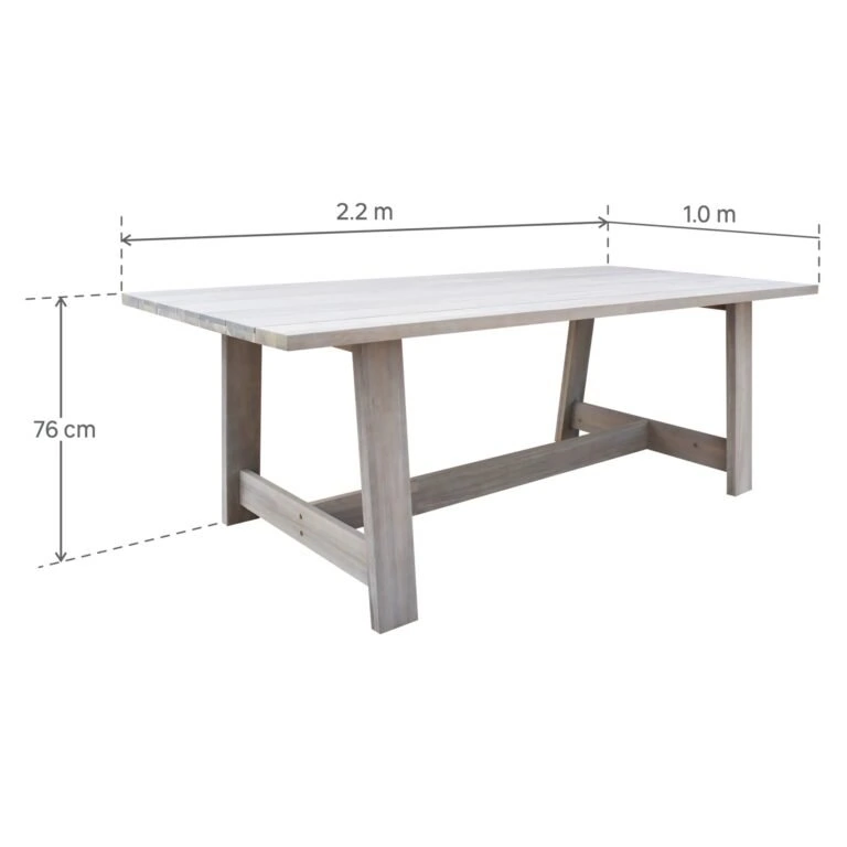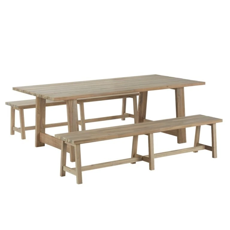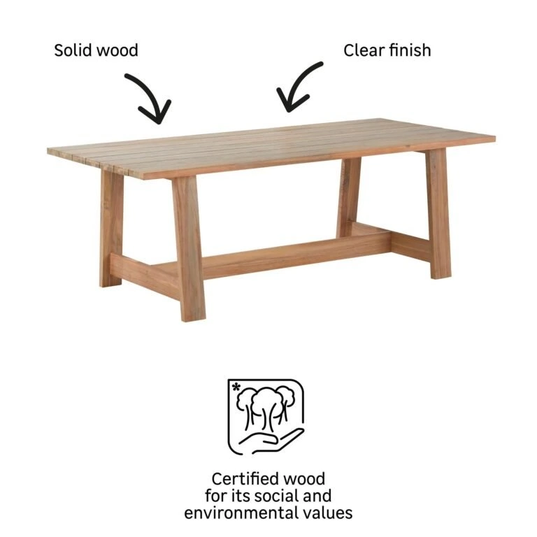 Esta mesa de madera ofrecerá a sus comidas al aire libre un ambiente de jardín, reforzado por los pies compactos e inclinados de la mesa, así como por sus grandes listones de madera. Adquirí los bancos largos de la misma gama para un estilo de casa de campo completo, y 2 bancos individuales Farm II Naterial para acomodar a 2 comensales más al final de la mesa.