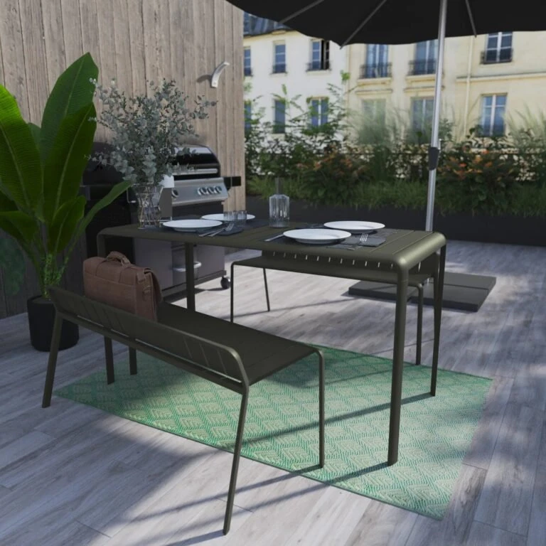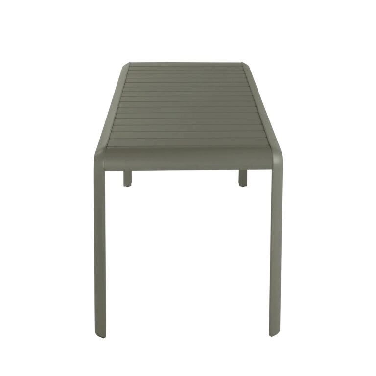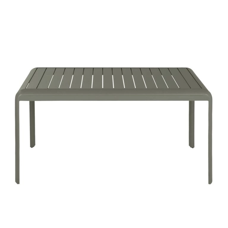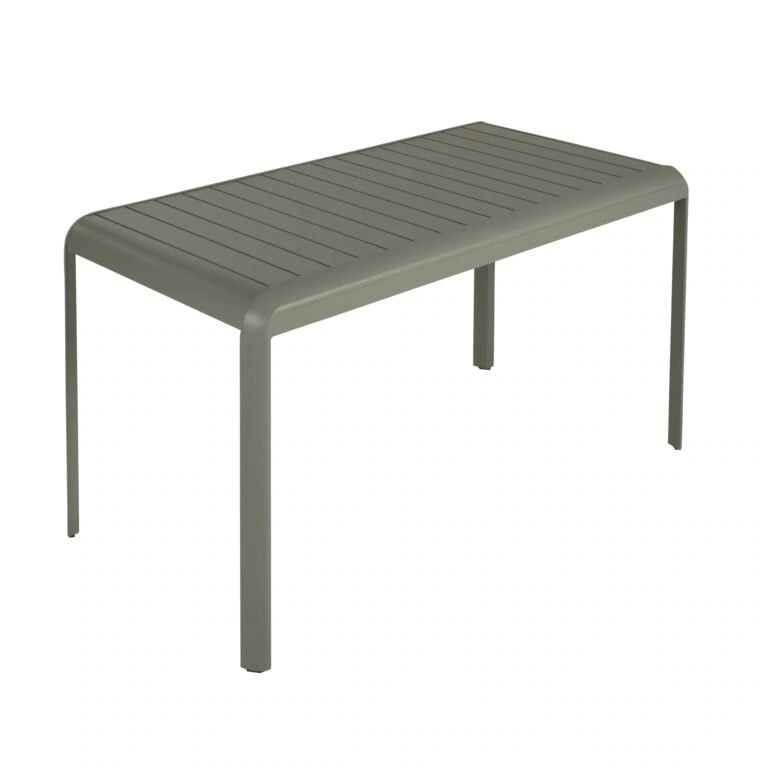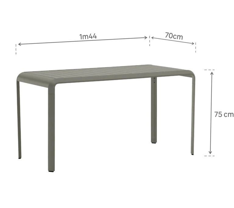 Su diseño de aluminio la convierte en una mesa ligera y resistente. Con sus tornillos de acero inoxidable, puede estar en el exterior todo el año. Se puede añadir una sencilla funda protectora para protegerla de la suciedad del invierno. En el día a día, un paño húmedo y un producto neutro bastan para el mantenimiento de tu mesa.
