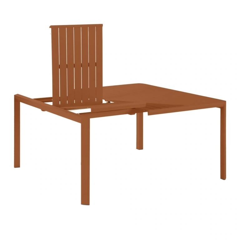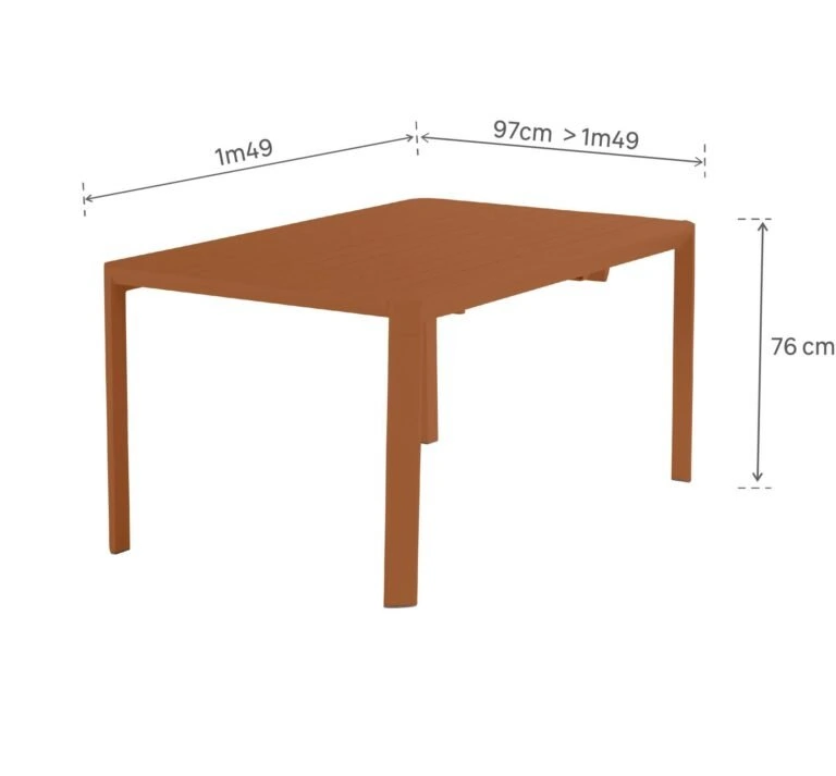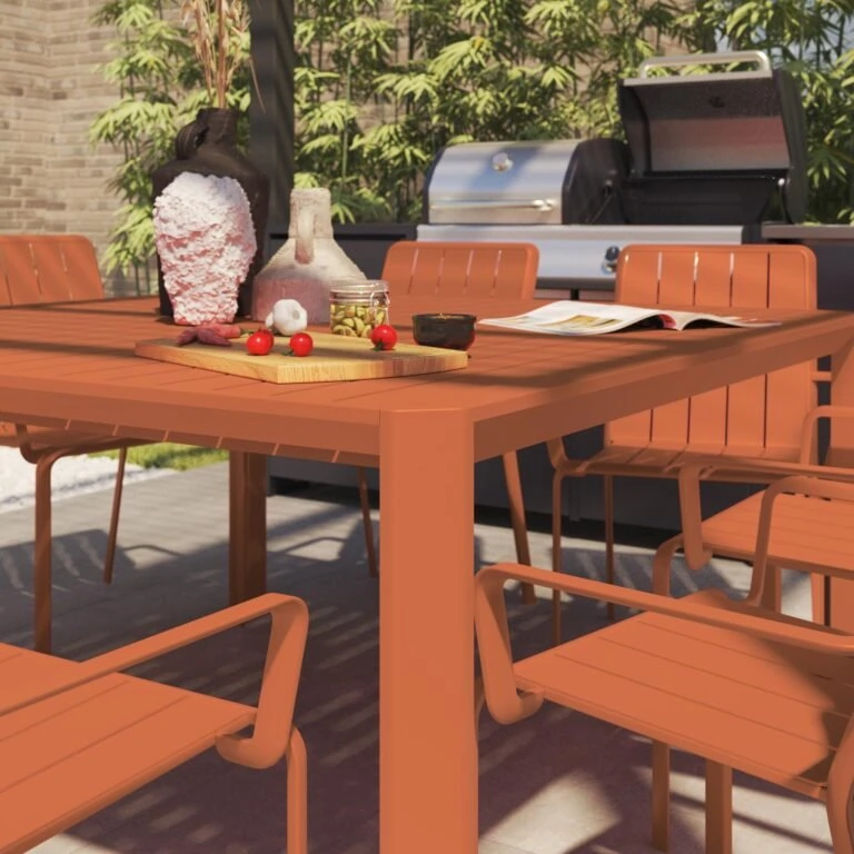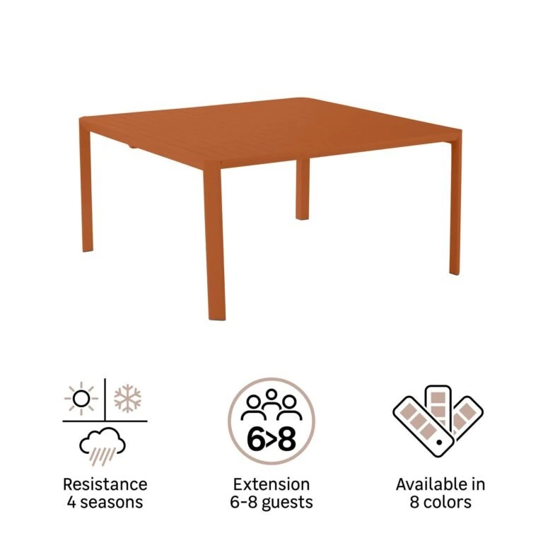Su diseño en aluminio la convierte en una mesa ligera y resistente. Con sus tornillos de acero inoxidable, puede estar en el exterior todo el año. Se puede añadir una simple funda protectora para protegerla de la suciedad del invierno. En el día a día, un paño húmedo y un producto neutro bastan para el mantenimiento de tu mesa.
