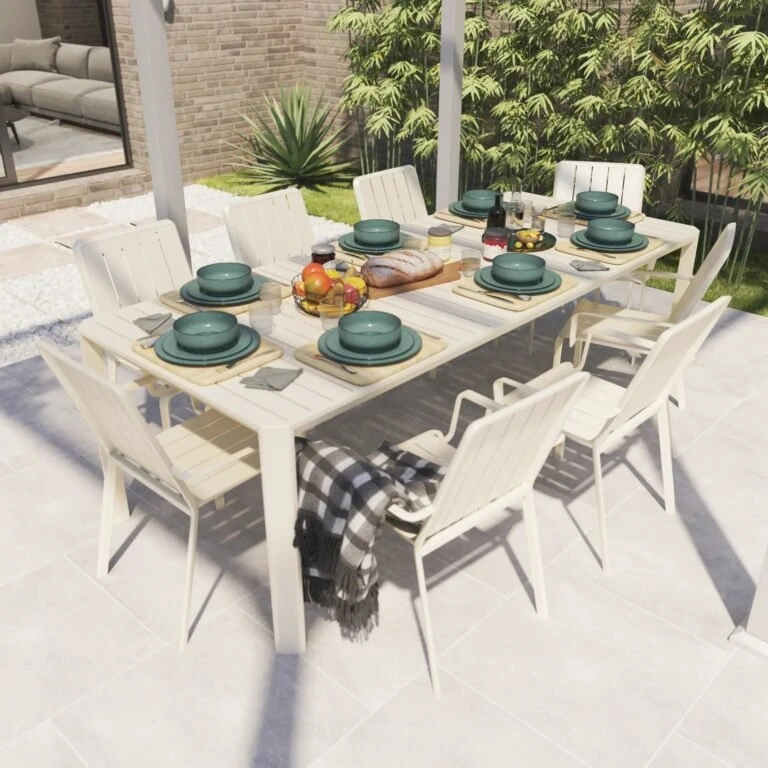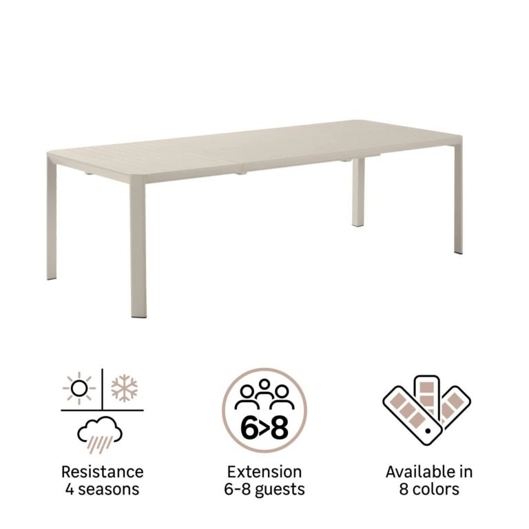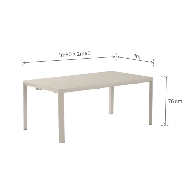 Dejá tu mesa en el exterior sin preocuparte por el tiempo que hace, organizá tu exterior tanto como quieras desplazándola fácilmente, disfrutá de un estilo atemporal que siempre acompañará a la mesa de jardín Idaho extensible. Organizá comidas de convivencia con los tuyos, con su extensión oculta bajo la bandeja, pasa de una mesa para 6 personas a una de 8 comensales para acomodar a tus invitados. Sus pies se mueven con la estructura para que nadie pase incomodidad al sentarse.