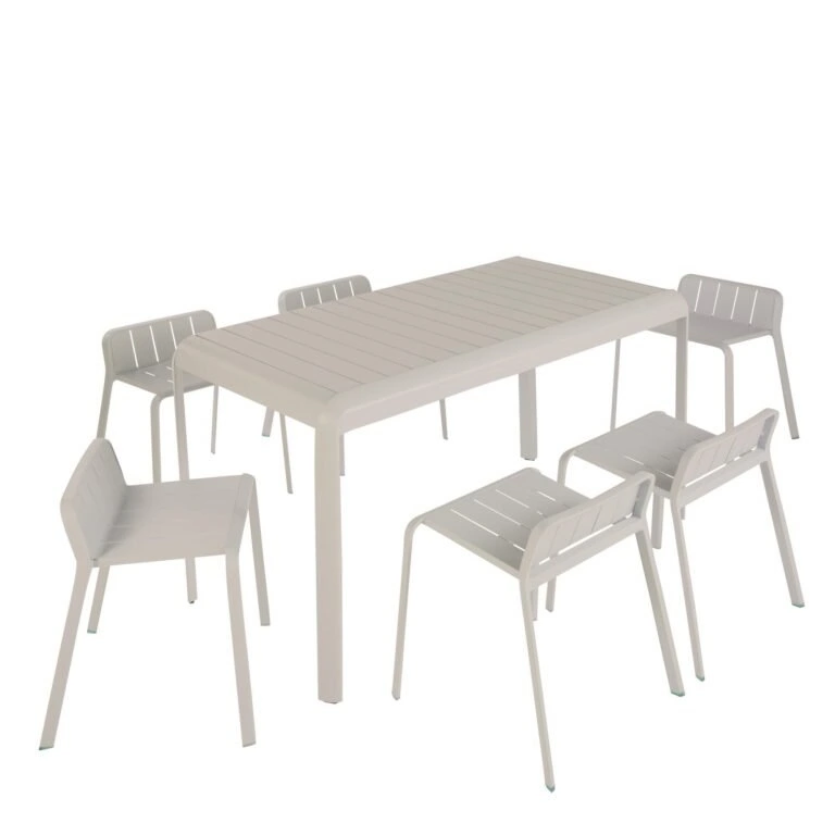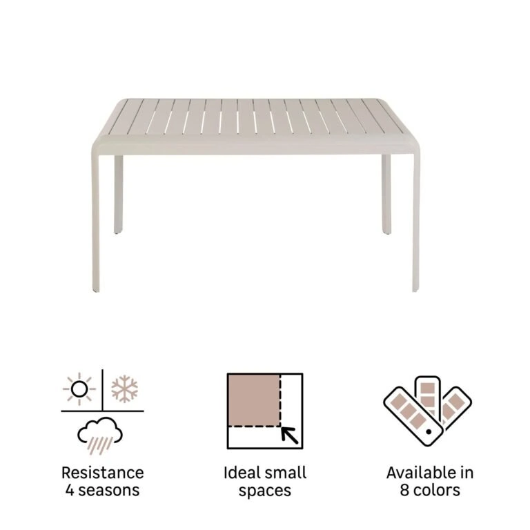 Su diseño de aluminio la convierte en una silla ligera y resistente. Con sus tornillos de acero inoxidable, puede estar en el exterior todo el año. Se puede añadir una sencilla funda protectora para protegerla de la suciedad del invierno. La práctica diaria, un paño húmedo y un producto neutro bastan para el mantenimiento de su mesa.
