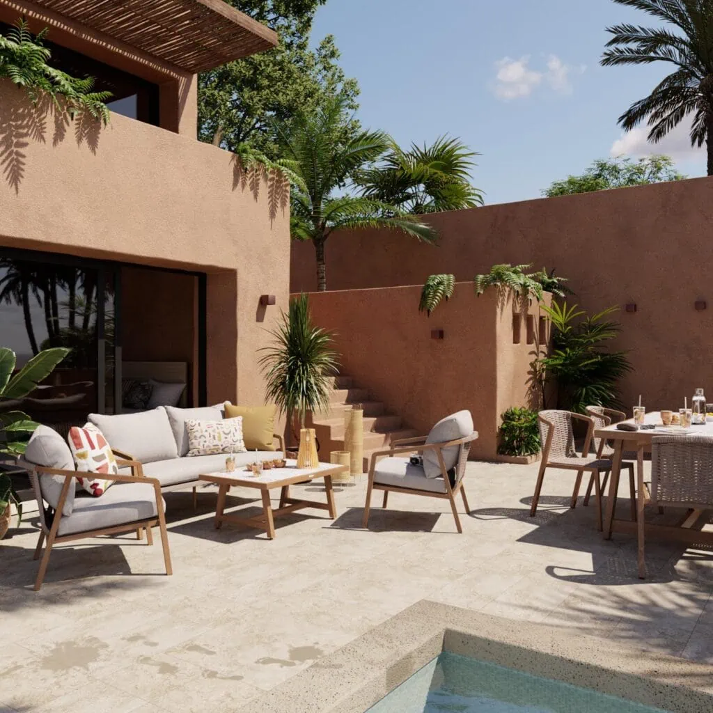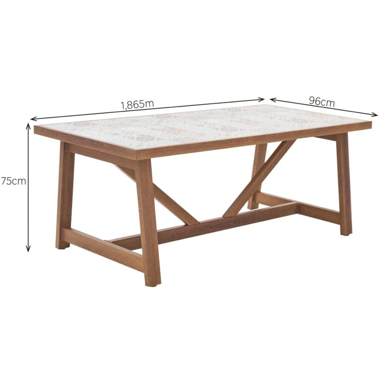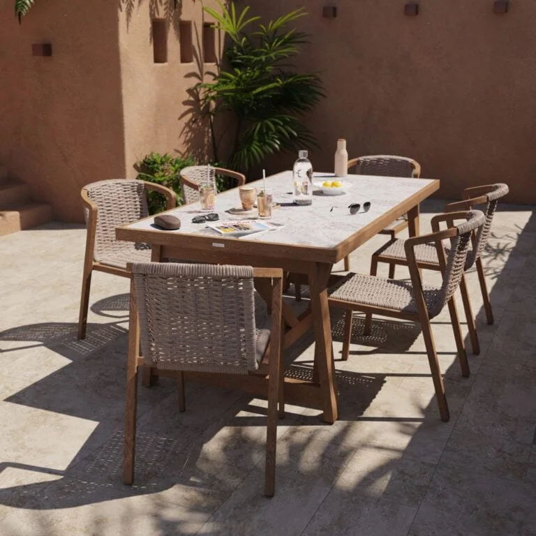 Una atractiva combinación de estructura de aluminio con efecto madera y un exclusivo tablero de cerámica, la mesa fija Gaia es ideal para comer al aire libre. Diseñada para hasta 6 personas, esta amplia mesa hará que su terraza sea aún más acogedora y funcional. Su estructura de aluminio y tablero de cerámica la hacen robusta, resistente a la intemperie y fácil de limpiar. La combinación perfecta para disfrutar de sus comidas al aire libre sin preocuparse por el desgaste diario.