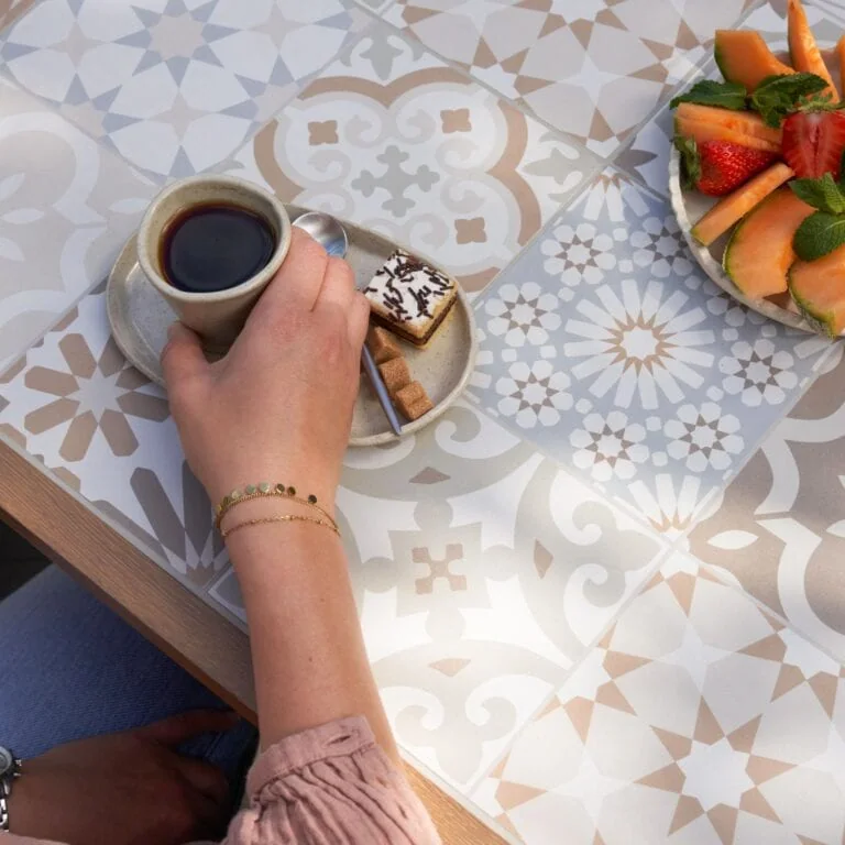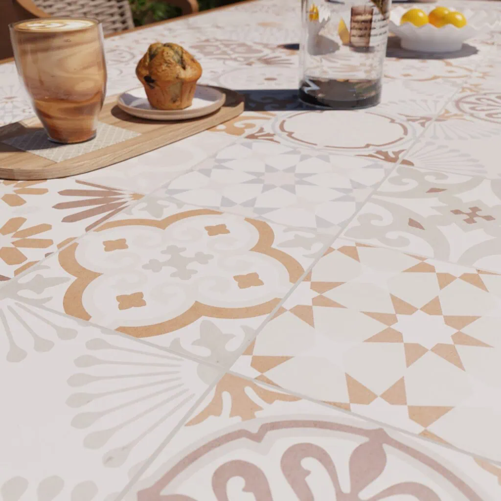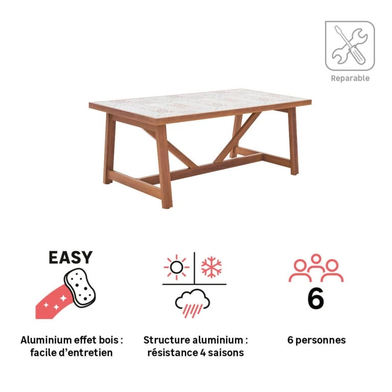 La originalidad de la gama Gaia reside en su tablero cerámico estilo loza, que realzará su espacio exterior. Este mosaico, combinado con aluminio imitación madera, le dará a su terraza un aspecto único. Combine esta mesa de jardín con las sillas tejidas de la serie para crear un espacio acogedor y original en su terraza. Relájese al aire libre durante más tiempo con el conjunto de muebles de jardín Gaia del mismo estilo. ¡La belleza del efecto madera, sin necesidad de mantenimiento! Diseñada para durar, esta mesa de jardín de aluminio imitación madera le dará a su terraza un aspecto acogedor, sin necesidad de mantenimiento.