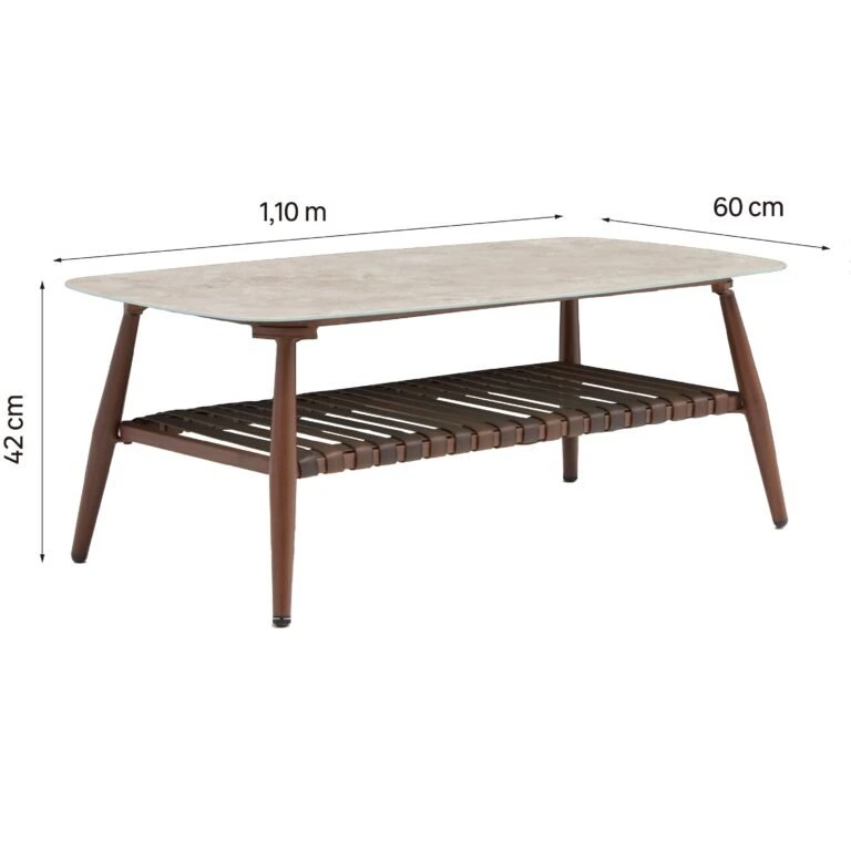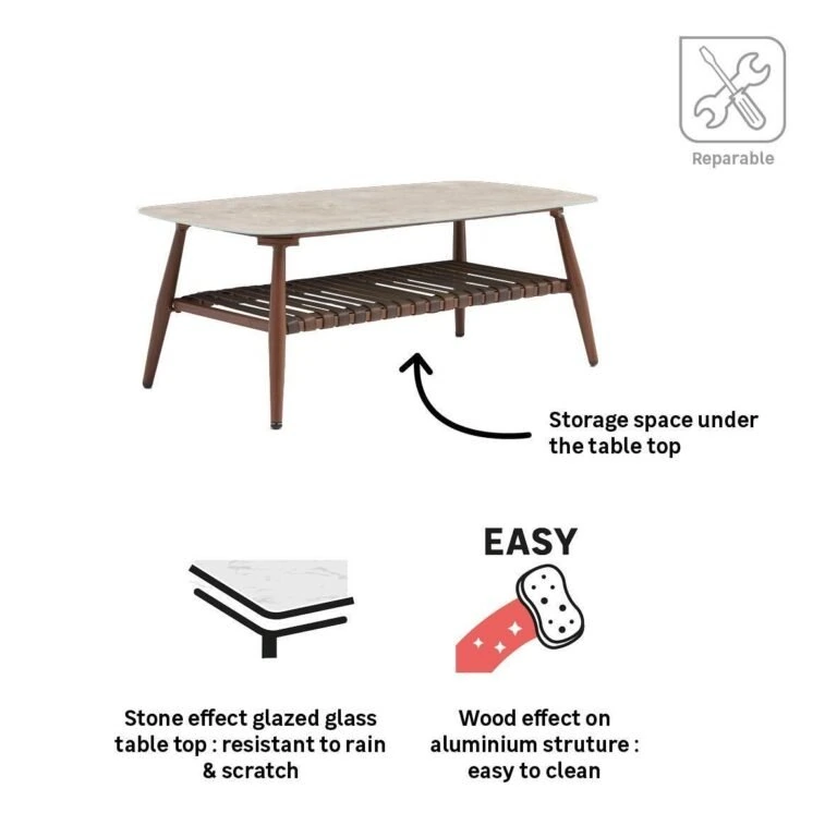 Disfrute de un momento agradable alrededor de la mesa de centro diaria retro, única y práctica. Compuesta por una estructura de aluminio efecto madera y una tapa de cristal esmaltado, esta mesa es naturalmente resistente a la lluvia, al frío y no teme al moho. Perfectamente adaptado a la altura de los sofás retro, te permite tener tus bebidas a mano. Una superficie de almacenamiento con tiras de cuero sintético, disponible debajo de la bandeja, mantiene tus libros o teléfonos a mano.