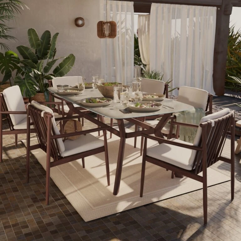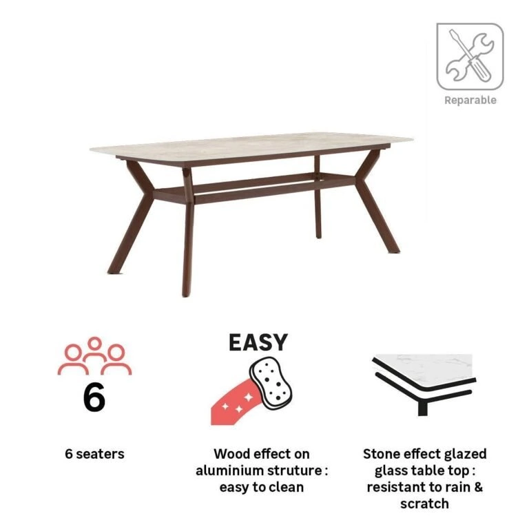 Con su bandeja de vidrio empapado con imitación de madera y su estructura de aluminio, esta mesa maría elegancia y durabilidad. Su diseño en aluminio la convierte en una mesa ligera y resistente, que puede permanecer en el exterior durante todo el año. Se puede añadir una sencilla funda protectora para protegerlo de la suciedad del invierno. Diariamente basta con un paño húmedo y un producto neutro para su mantenimiento. Hay repuestos reparables disponibles para prolongar la vida útil de sus muebles.