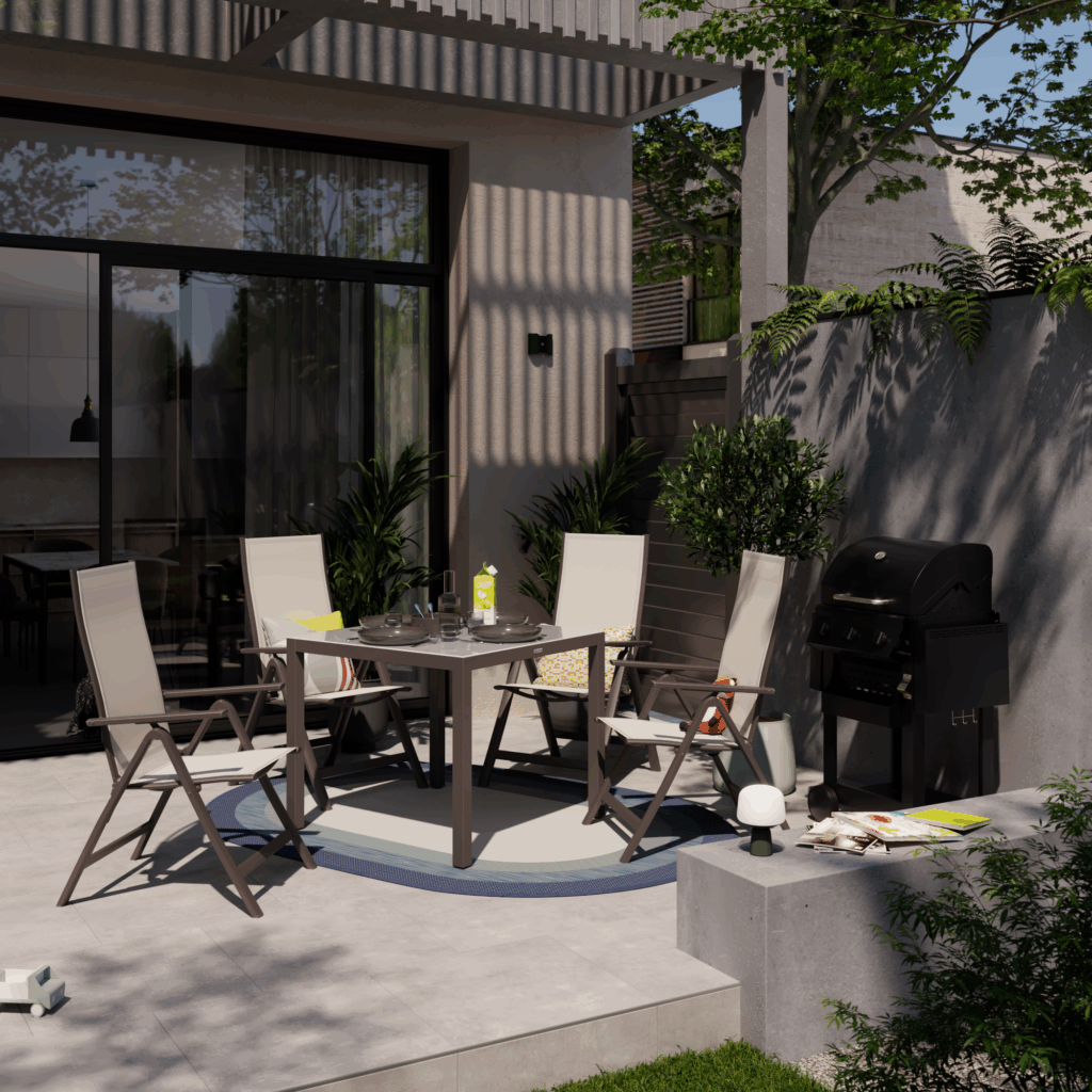 Con sus líneas geométricas y sus patas rectangulares, esta mesa de diseño contemporáneo aporta un toque elegante y moderno a tu espacio exterior. La combinación de aluminio color moca y cristal aporta una estética refinada, al tiempo que ofrece una resistencia óptima a las inclemencias del tiempo. Para completar tu espacio de comedor, combina esta mesa con las sillas Lyra Beta II o las sillas multiposición Odyssea. La mesa y las sillas de la gama Lyra también están disponibles en blanco y antracita, lo que permite crear un conjunto armonioso.