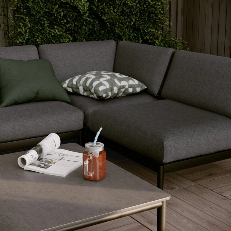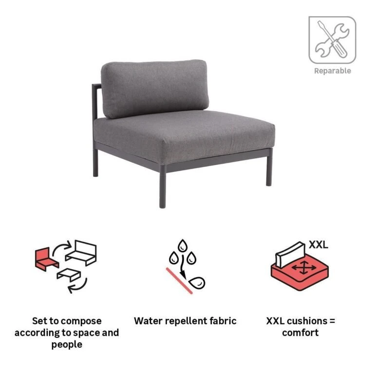 El módulo de sillón individual Idunn es parte de un conjunto de mobiliario de jardín modular que combina comodidad y diseño para disfrutar de momentos de café con amigos. Con una estructura de aluminio resistente y almohadones impermeables, ofrece un asiento óptimo para tu terraza. La serie Idunn combina elegancia y practicidad, con un diseño moderno que se adapta al número de invitados. Fácil de mantener y duradero, es ideal para espacios al aire libre.