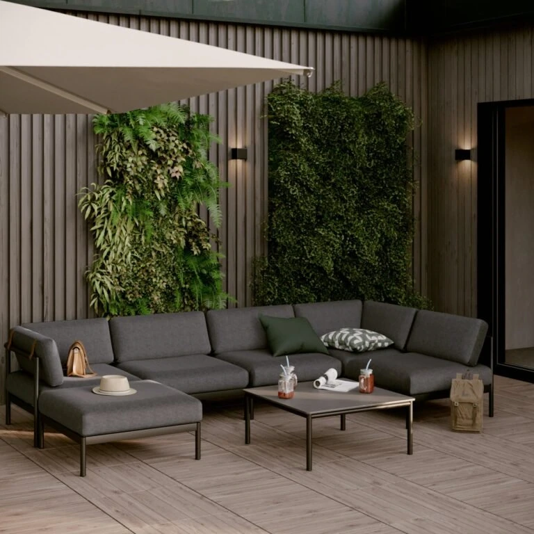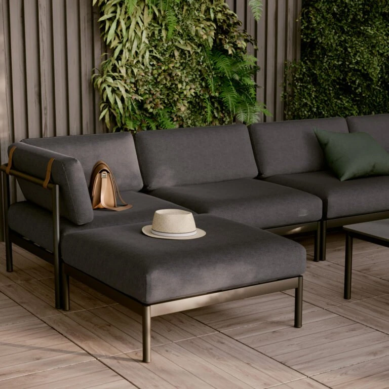 La gama Idunn combina la elegancia del diseño y la practicidad. Este sillón de aluminio negro y almohadones de color antracita se realza con los lazos marrones de efecto cuero. Combinado con otros elementos de la gama, este módulo creará un conjunto de sofá esquienro de jardín que se adaptada al número de invitados, añadiendo un toque de modernidad a tus espacios exteriores.