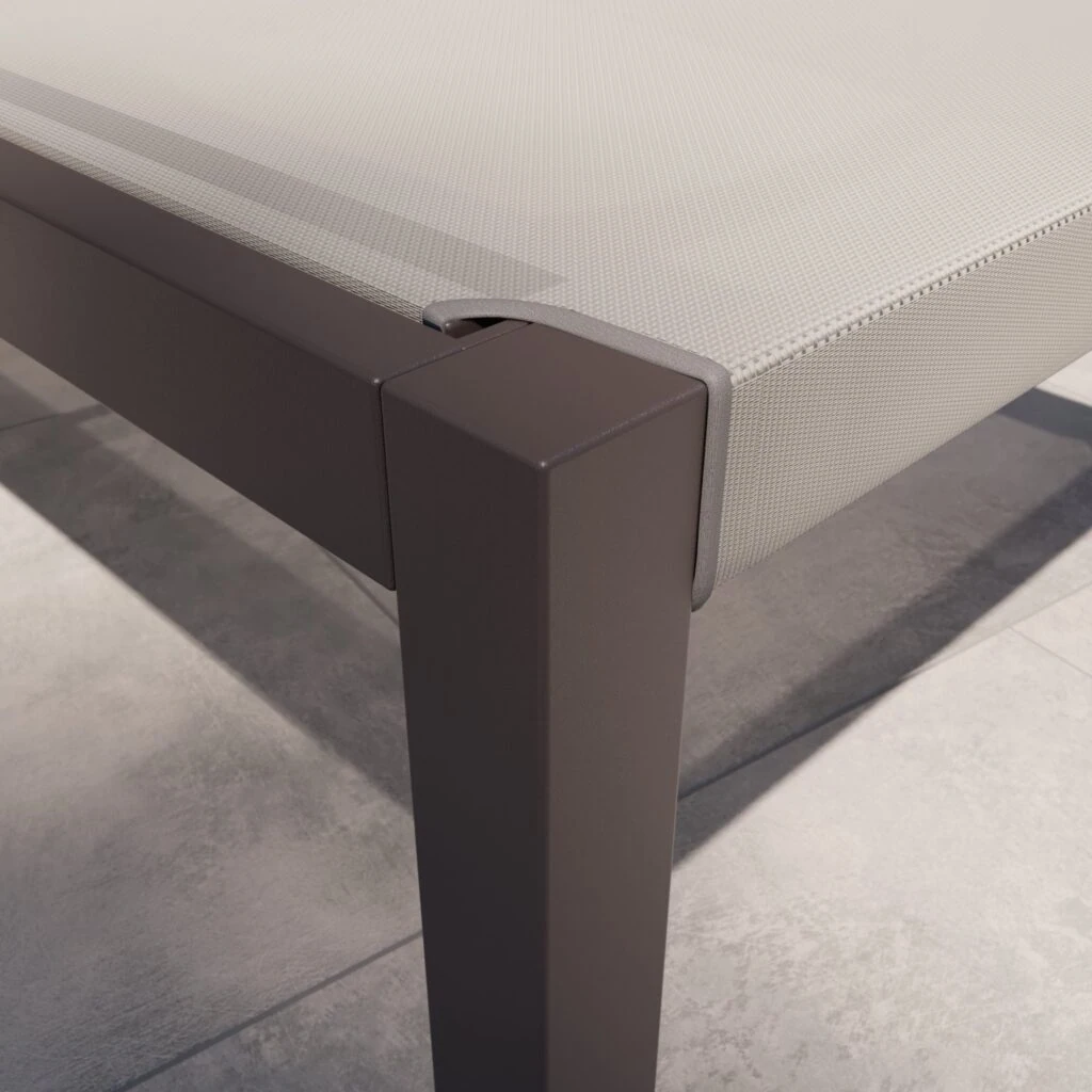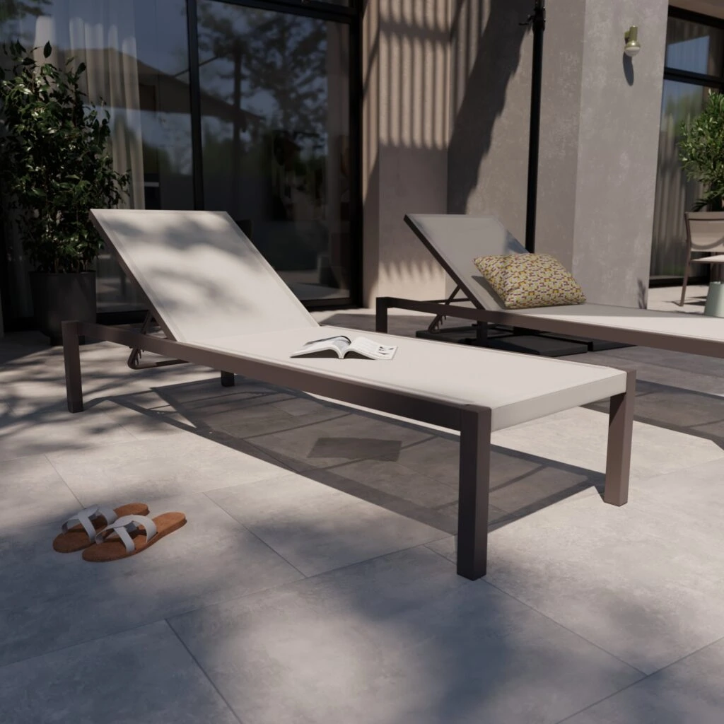 Equipada con un revestimiento de textilene, la reposera Lyra garantiza una comodidad óptima. Este tejido es flexible y se adapta a las curvas del cuerpo para disfrutar de agradables tardes bajo el sol. Su respaldo ajustable ofrece cuatro posiciones diferentes para ajustarse a sus necesidades. Diseñada con materiales ligeros y resistentes, la reposera Lyra es la combinación perfecta entre comodidad y funcionalidad. Ligera y móvil, se mueve en un abrir y cerrar de ojos gracias a sus ruedas. Su estructura, fabricada íntegramente en aluminio, garantiza una alta resistencia a la oxidación y la humedad, y su textilene trenzado permite el paso del aire y el agua, y se seca rápidamente después de una ligera lluvia. Por lo tanto, es ideal para usar junto a la piscina.