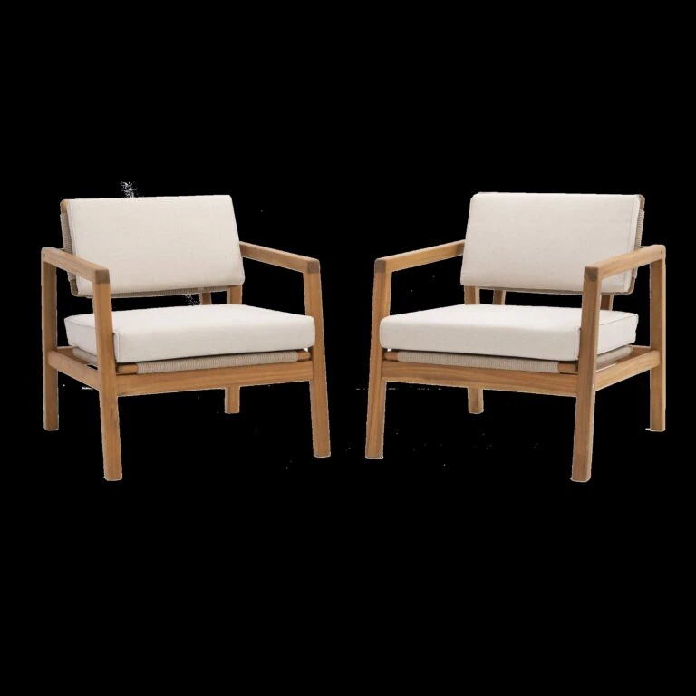 Una delicada combinación entre una estructura de acacia y un asiento de cuerda, el conjunto de dos sillones bajos Oasis ofrece la comodidad ideal para tus aperitivos al aire libre. Fabricado en acacia, este conjunto aportará calidez a tu terraza. Se puede usar con o sin almohadones (incluidos) y será ideal para todas tus actividades. Apto para uso profesional, también se puede usar en la terraza privada de un hotel.