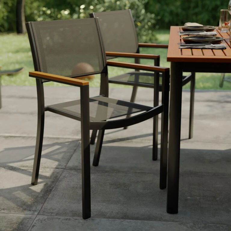 La silla Oris es el complemento perfecto para los productos de la gama Oris. Su diseño práctico y agradable hace que sea fácil de combinar con otros muebles de jardín. La silla está diseñada para ofrecer una buena sujeción y un confort permanente gracias a que su asiento y respaldo fabricados en textileno, un material que se adapta a las curvas del cuerpo y proporciona una gran comodidad al sentarse. Su doble trama aumenta la resistencia del asiento y respaldo a lo largo del tiempo. Los reposabrazos de la silla están fabricados con madera de eucalipto proveniente de una gestión forestal consciente del medio ambiente, socialmente beneficiosa y económicamente sostenible. La estructura de la silla está fabricada en aluminio, un material resistente a la humedad y el óxido. Además, es ligera y funcional, lo que permite apilarlas para un fácil almacenamiento. Con estas sillas, podrás disfrutar de tus comidas al aire libre en un ambiente auténtico y moderno.