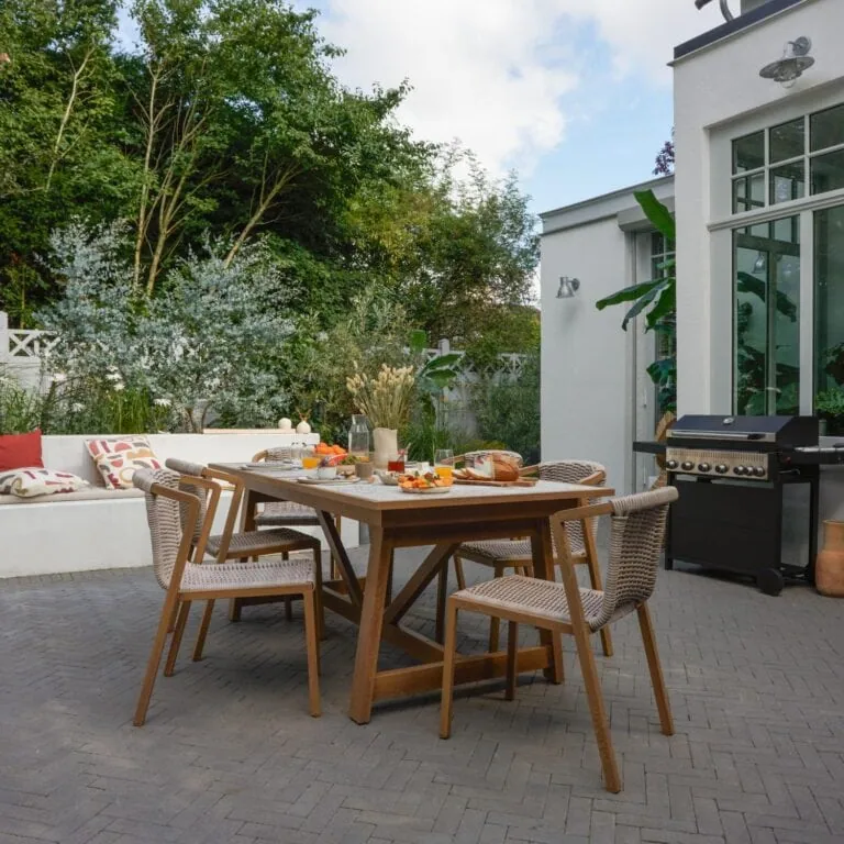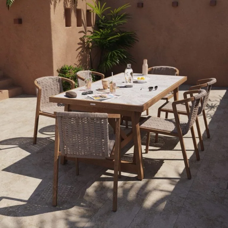 La silla Gaia, combinada con aluminio efecto madera, le dará un toque único a su terraza. Los asientos, tejidos con cuerda sintética que imita la cuerda natural, no solo son estéticos, sino que también garantizan durabilidad y resistencia. Prolongue sus momentos de relajación al aire libre con la mesa de comedor Gaia y los muebles de exterior de la misma serie, y su tablero de cerámica estilo loza, que realzará su espacio exterior.
