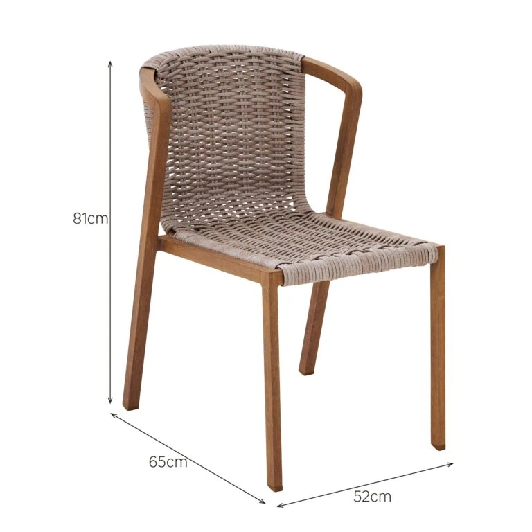 Una silla cómoda con un estilo natural para barbacoas en la terraza. Con una agradable combinación de estructura de aluminio con efecto madera y asiento tejido, la silla de jardín Gaia ofrece la máxima comodidad para disfrutar de sus comidas al aire libre. Su estructura de aluminio y asiento de cuerda sintética la hacen robusta, impermeable y fácil de limpiar. Es apilable, por lo que se puede guardar fácilmente en invierno o cuando sus invitados se marchen. Los asientos de cuerda sintética tejida, que imitan la cuerda natural, no solo son agradables a la vista, sino que también garantizan durabilidad y resistencia. Una gama natural y combinable. El taburete Gaia, combinado con aluminio con efecto madera, le dará a su terraza un aspecto único. Los asientos de cuerda sintética tejida, que imitan la cuerda natural, no solo son agradables a la vista, sino que también garantizan durabilidad y resistencia. Relájese aún más al aire libre con los muebles de jardín Gaia, con su tablero de cerámica estilo loza, que realzará su espacio exterior. ¡La belleza del efecto madera, sin necesidad de mantenimiento! Diseñada para durar, esta silla de jardín de aluminio con efecto madera y cuerda sintética le dará a su terraza un aspecto acogedor, sin necesidad de mantenimiento. Solo necesita un paño húmedo y un producto neutro para limpiarlo. Para proteger sus muebles, le recomendamos cubrirlos cuando no los use para protegerlos de la suciedad