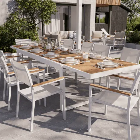 Fabricada en aluminio resistente a la intemperie y teca con certificación FSC, toda la gama Persea aporta un elegante aspecto moderno a su terraza. Disponible en antracita y blanco, esta silla de jardín complementa a la perfección las mesas fijas y extensibles de Persea para crear un acogedor comedor al aire libre. Relájese aún más en la terraza con los conjuntos de muebles de jardín o la reposera de la misma colección. Materiales resistentes y duraderos.