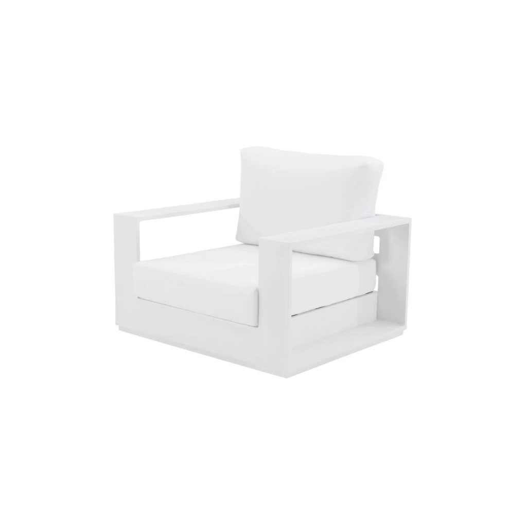 Como toda la línea Lagun, el sillón presenta líneas limpias. Para amplificar su aspecto contemporáneo, sus brazos angulares tienen grandes aberturas. El color blanco de la estructura se prolonga en los almohadones para un look moderno tono sobre tono. Para completar el conjunto, combinalo con la mesa de centro y el sofá de la misma serie.