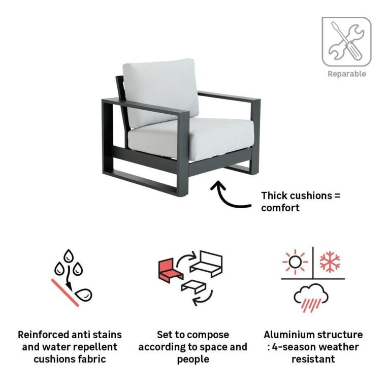 Disfrute de un aperitivo con amigos cómodamente instalado en el sillón Athena. Un sillón de diseño y confortable para tus calurosas tardes de verano Ideal para tus veladas con amigos, el Sofá Athena combina comodidad y elegancia para realzar tu terraza. Sus cojines grandes y gruesos ofrecen un asiento óptimo y aportarán un efecto lounge a tu exterior. Con estructura de aluminio y cojines impermeables y desenfundables, esta silla es sinónimo de resistencia y solidez para acompañarte año tras año. Calificado para uso profesional, también se puede utilizar en un hotel o en una terraza de café. Una gama contemporánea y modular Fabricada en aluminio grueso, las líneas de la serie Athena son rectas y refinadas para lograr un diseño y un efecto aireado. Este sillón con estructura antracita y cojines grises le dará un aspecto moderno y elegante a tu exterior. Se completa con las mesas bajas y otros sillones de la serie para aumentar el número de plazas y adaptar la configuración en función de tus invitados. Toda la gama también está disponible en blanco. Materiales de fácil mantenimiento Práctico en el día a día, tu salón Athena se limpia fácilmente con un paño húmedo y un producto neutro. Los cojines son desenfundables y su funda se cambia a máquina. Para preservar su calidad, recuerda cubrir tus muebles de jardín con una funda de natery durante la invernada. Hay repuestos reparables disponibles para prolongar la vida útil de sus muebles.
