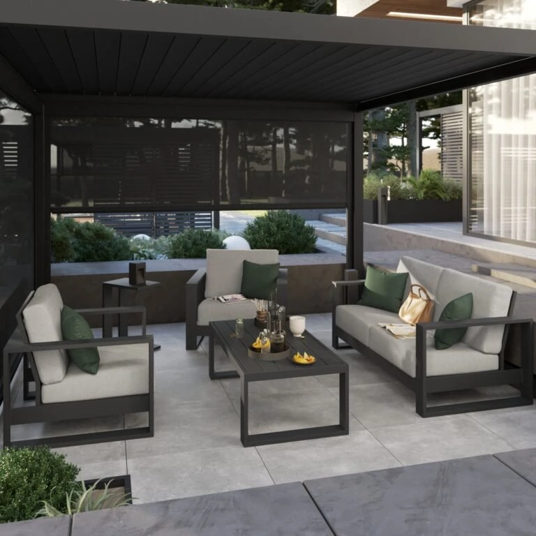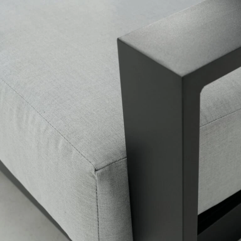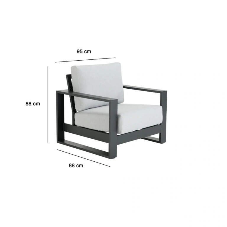 Fabricado en aluminio grueso, las líneas de la serie Athena son rectas y depuradas para conseguir un efecto de diseño y ligereza. Este sillón con estructura antracita y almohadones grises dará un aspecto moderno y elegante a su exterior. Se completa con las mesas bajas y los sillones de otras series para aumentar el número de plazas y adaptar la configuración en función de sus invitados. Toda la gama está disponible también en blanco.