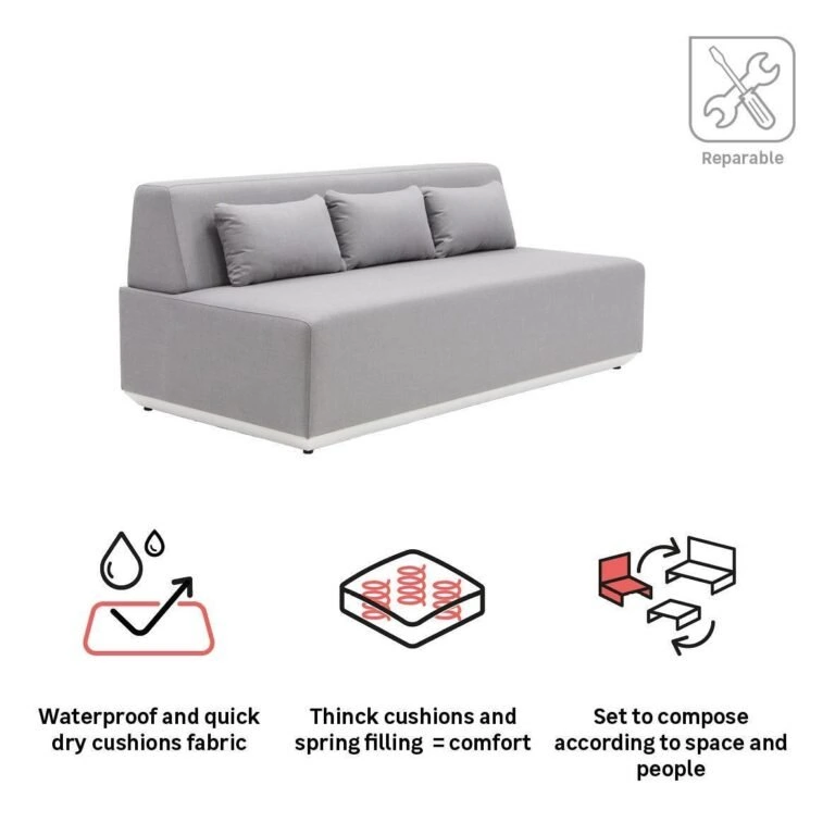 Elemento complementario de la serie Neptune, el sofá de 3 plazas combina comodidad y elegancia para realzar tu terraza. Utilizado solo o asociado a otros módulos para crear un mueble de jardín esquinero, este módulo de almohadon ancho y grueso con muelles ofrece un asiento óptimo. Con estructura de aluminio y almohadones impermeables, este sofá es sinónimo de resistencia y solidez para acompañarte año tras año. Calificado para uso profesional, también se puede utilizar en un hotel o en una terraza de café.
