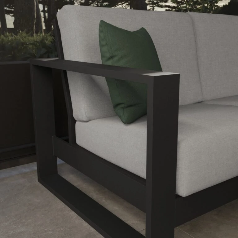 Fabricada en aluminio grueso, las líneas de la serie Athena son rectas y depuradas para conseguir un efecto de diseño y ligereza. Esta versión de tres plazas con estructura antracita y almohadones grises dará un aspecto moderno y elegante a su exterior. Se completa con las mesas bajas y los sillones de otras series para aumentar el número de plazas y adaptar la configuración en función de sus invitados. Toda la gama está también disponible en blanco.