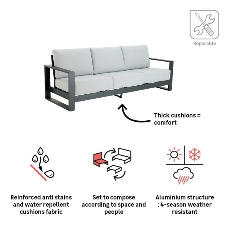 Diseñado para 3 personas, el sofá Athena combina comodidad y elegancia para realzar su terraza. Sus almohadones grandes y gruesos ofrecen un asiento óptimo para sus veladas estivales, y aportarán un efecto lounge a su exterior. Con una estructura de aluminio y almohadones impermeables y desenfundables, este sofá es sinónimo de resistencia y solidez para acompañarle año tras año. Calificado para un uso profesional, también puede utilizarse en la terraza de un hotel o de un café.