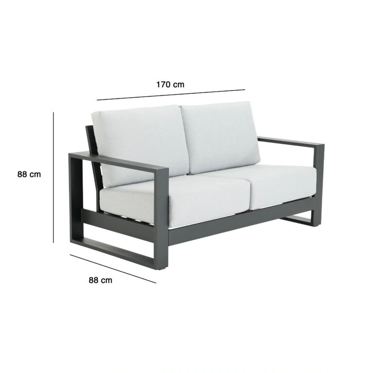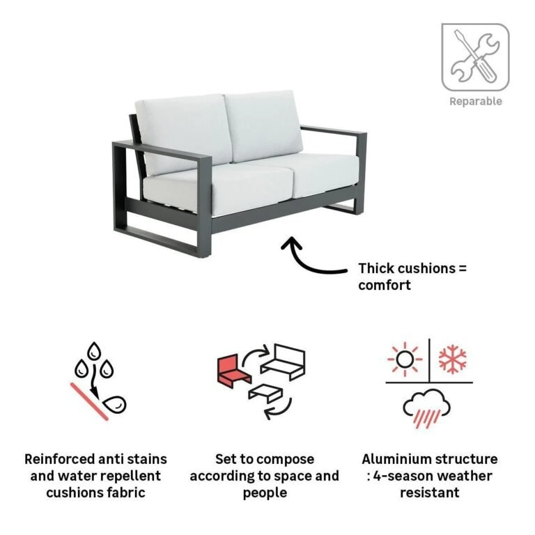 Fabricada en aluminio grueso, las líneas de la serie Athena son rectas y depuradas para conseguir un efecto de diseño y ligereza. Esta versión de dos plazas con estructura antracita y almohadones grises dará un aspecto moderno y elegante a su exterior. Se completa con las mesas bajas y los sillones de otras series para aumentar el número de plazas y adaptar la configuración en función de sus invitados. Toda la gama está también disponible en blanco.
