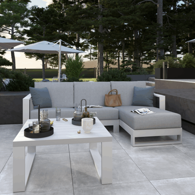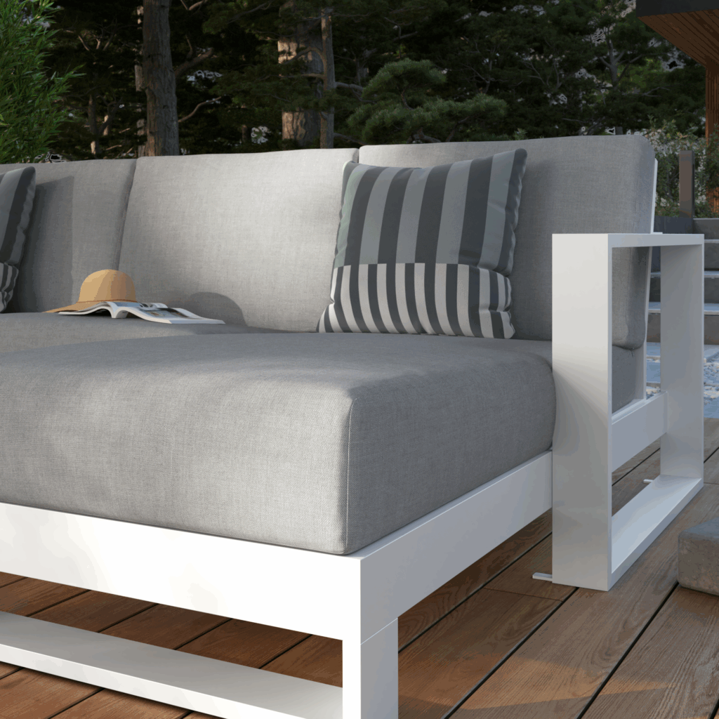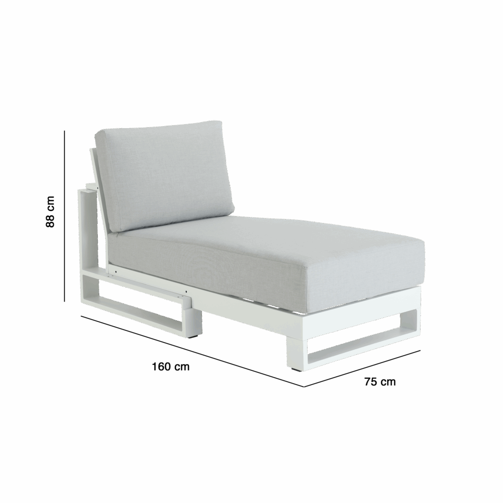 Fabricadas en aluminio grueso, las líneas de la serie Athena son rectas y refinadas para un efecto de diseño y aireado. Este elemento para acoplar a los sillones o sofás de la gama, con su estructura blanca y sus cojines claros, dará un aspecto moderno y elegante a tu exterior. Integrada en el conjunto completo Athena, esta chaise longue se adapta armoniosamente al resto de elementos de la colección. Toda la gama también está disponible en gris antracita.