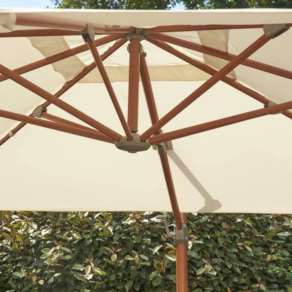 La sombrilla Agora le protege y aporta un toque natural a su terraza o jardín. Su mástil de aluminio con efecto madera y su lona blanca le darán a su terraza un aire cálido y combina a la perfección con gamas de madera natural como Oasis o Aurora.