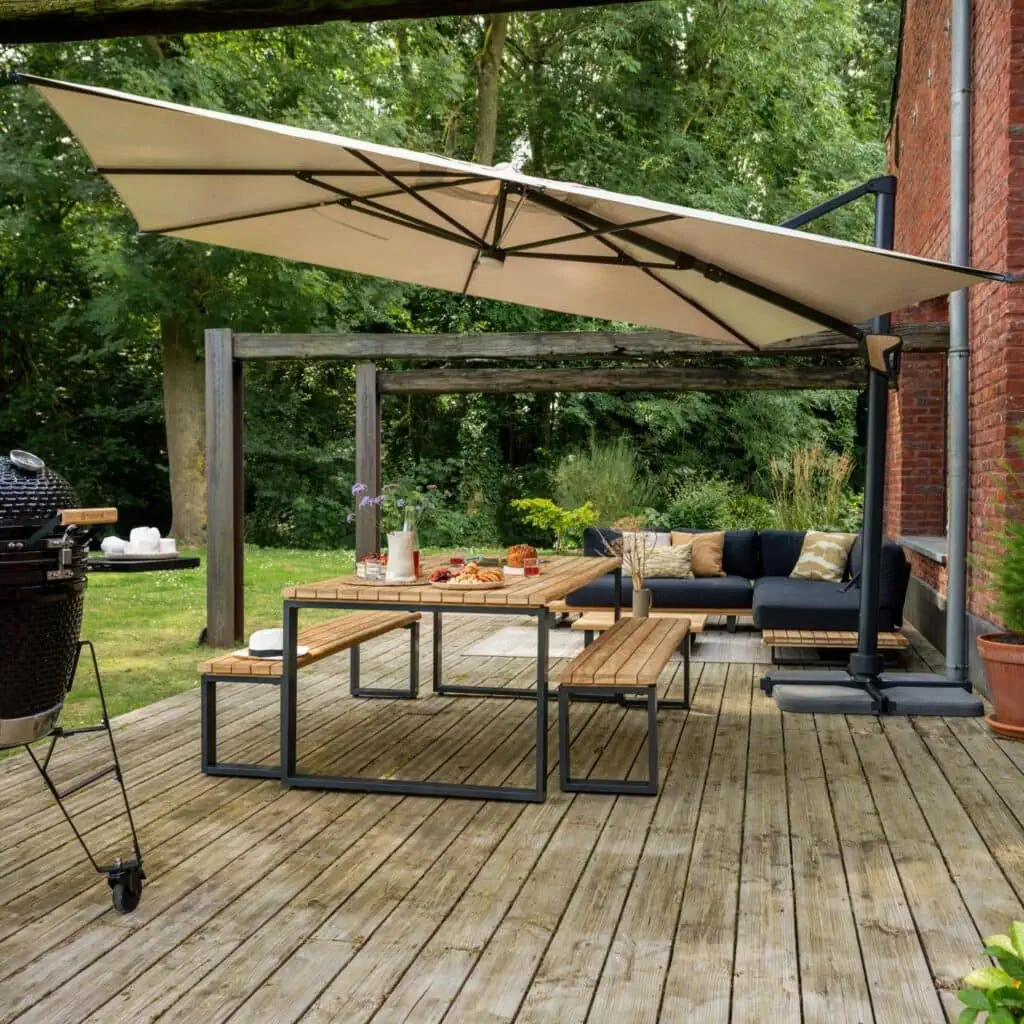 Como la tela de la sombrilla está hecha de acrílico, impermeable y especialmente resistente a los rayos UV, no hay riesgo de que se decolore con el uso diario. La estructura de aluminio inoxidable se limpia fácilmente con un paño húmedo y un producto neutro. Para prolongar su vida útil, la tela de la sombrilla está disponible como repuesto. Se incluye una funda de invierno para protegerla cuando no se use durante largos periodos. Para una estabilidad óptima y resistencia al viento, se recomienda lastrar la sombrilla con 8 bases de 25 kg cada una, o con un peso total mínimo de 200 kg.