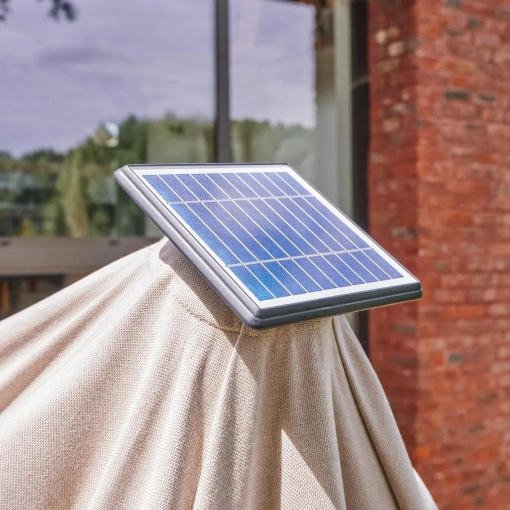 Al atardecer, disfrute de un ambiente acogedor bajo la sombrilla con su iluminación LED, que se recarga con energía solar o cable USB. La sombrilla Odyssea Premium le da un toque elegante a su terraza, con LED integrados en las ramas y el centro de la estructura. Combina a la perfección con un conjunto de muebles de jardín o un elegante comedor en tonos antracita.